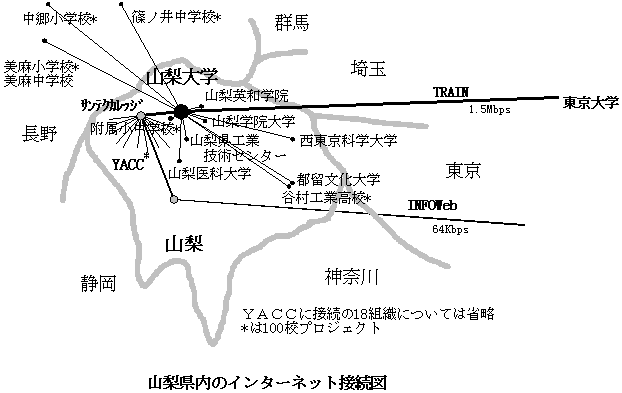 山梨県でもインターネットは盛んです.盛んだというより先進地域であると言ってもよいかも知れません.山梨県下には現在三つのインターネット組織があります.その一つはアカデミックネットワークで,山梨大学情報処理センターと東京大学がTRAIN(Tokyo Region Academic Information Network)のコードネームで接続され,これが全国およびアメリカ・アジア・オセアニアに接続されています.山梨大学配下には,山梨医科大学・都留文化大学・山梨学院大学・山梨英和学院短期大学・西東京科学大学・山梨県工業技術センター・学校法人サンテクノカレッジ,それに初等中等教育実験校として山梨大学附属小学校・谷村工業高校・長野市立篠ノ井中学校・長野県美麻村立美麻小中学校・新潟県中郷町立中郷小学校が,コードネーム「TRAIN山梨」としてつながっています.さらに,サンテクノカレッジの配下には「YACC」というコードネームで,百貨店・新聞社・放送局・製造業・ソフトウェア企業・小売業・印刷業・医師団体・観光組合・ワイン業者のグループ・県立増穂商業高校など県内の一八組織(九五年一一月一日現在)が接続され,それぞれに活躍しています.その他,主に個人加入者を接続する民間のプロバイダ「インターネット山梨」があります.